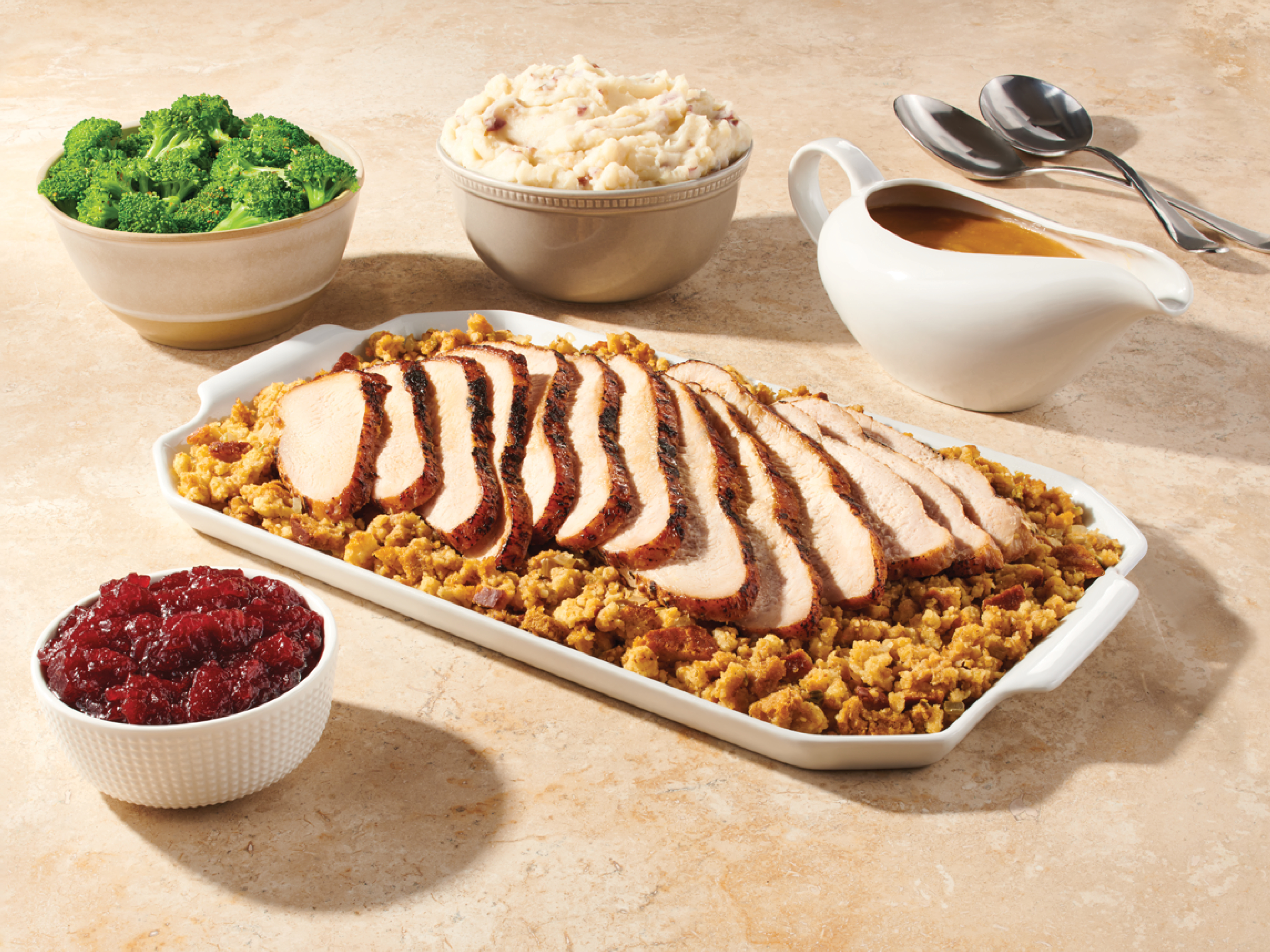 • Turkey and Dressing Dinner: This classic Thanksgiving meal features a tender, carved turkey breast, savory stuffing, rich turkey gravy, and cranberry sauce. The dish comes with two sides and dinner bread.
